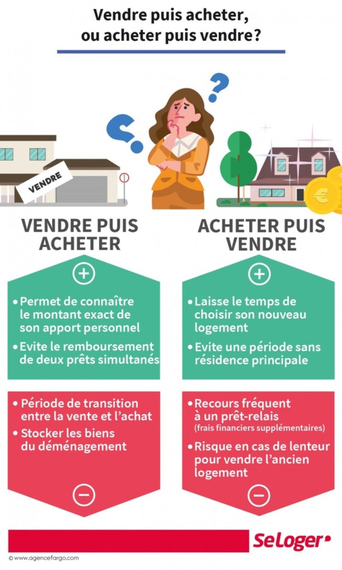 Vous voulez vendre votre logement et en acheter un autre mais vous ne savez pas dans quel sens vous y prendre. Pour vous aider à y voir plus clair, SeLoger vous donne les avantages et les inconvénients de chaque solution.